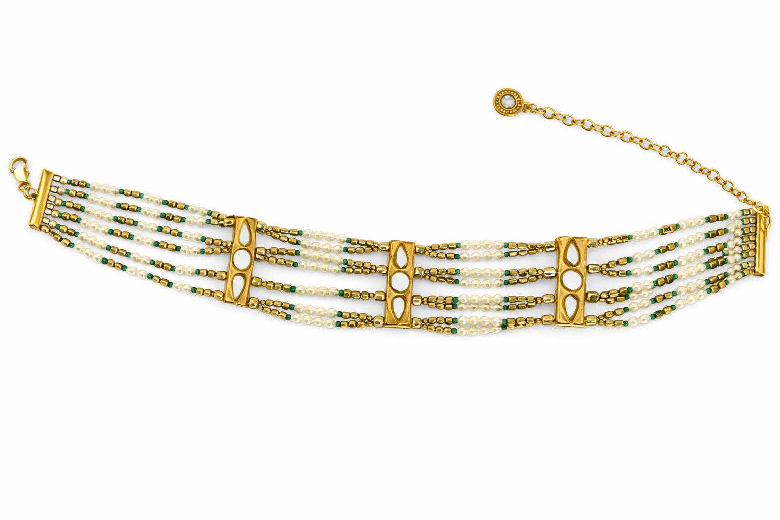 Intricate Craftsmanship: Features multiple rows of meticulously strung gold beads interspersed with delicate white pearls for a rich, textured look.