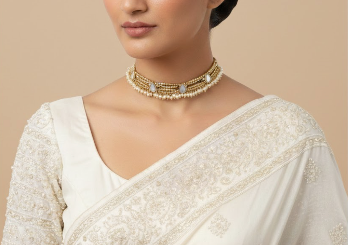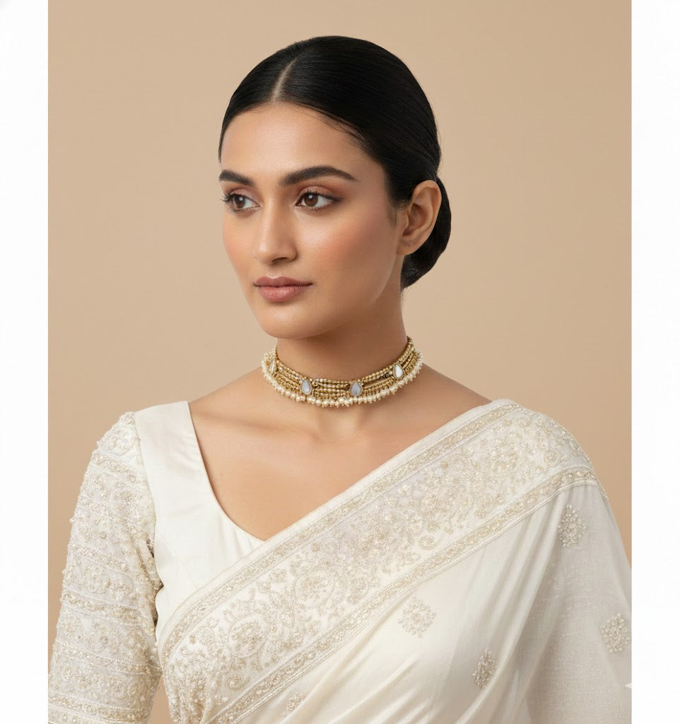Discover timeless elegance with this adjustable gold choker by designer Ritika Sachdeva, featuring bent hammered drops, mirror-studded detailing, and delicate pearl embellishments. Handcrafted using high-quality brass metal and finished with rich gold plating, this statement choker reflects a perfect balance of traditional artistry and contemporary design. The reflective mirror elements add subtle brilliance, while the pearls lend a refined, feminine touch, making it ideal for festive occasions, weddings, and modern ethnic styling. Designed for comfort and versatility, the adjustable fit allows easy wear across necklines. As each piece is handmade, slight variations in the placement of embellishments may occur, enhancing the uniqueness and artisanal charm that defines Ritika Sachdeva jewellery.